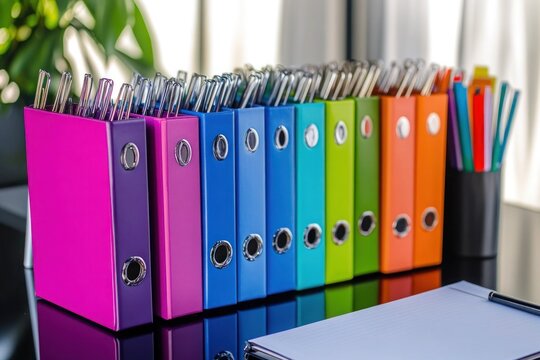 A colorful assortment of binders, notebooks, and stationery neatly lined up on a modern desk.