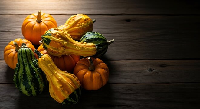 Assortment of Autumn Gourds and Pumpkins on Wooden Surface fall harvest