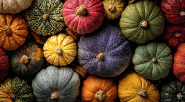 A variety of colorful decorative gourds and pumpkins with different shapes and textures.