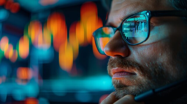 Close-up of a trader leveraging margin trading with colorful financial charts reflected in glasses.