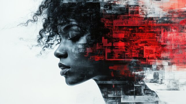 A blurred silhouette of a young woman with short hair against a gradient of blue and red light. The image conveys themes of identity and technology.