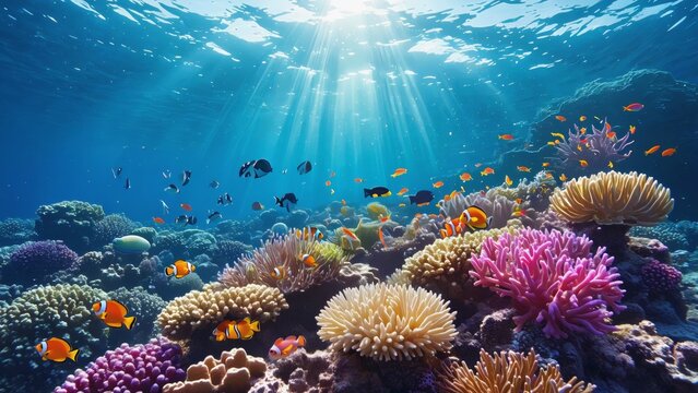 turtle with group of colorful fish and sea animals with colorful coral underwater in ocean