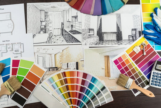 architect drawing of modern apartament blueprints with color paper material sample on creative desk