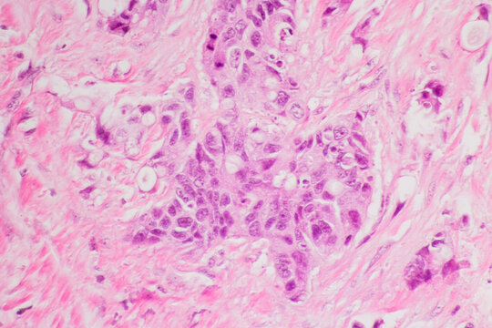 Backgrounds of human cells tissue of lung human under the microscope in pathology lab.View in microscopic of ductal cell carcinoma, adenonocarcinoma from human breast cancer, tissue section by H and E