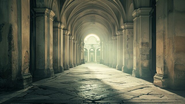 Sunlit gladiators wrestling over wooden staff in ancient colonnade arena roman combat