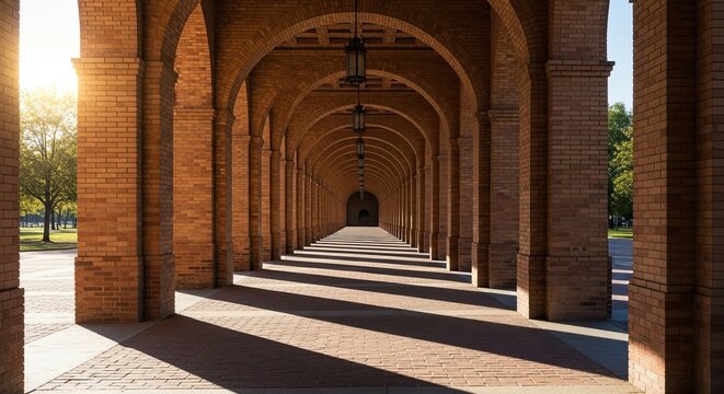 Hispanic man reclining on wooden bench in sunlit historic colonnade with arches, promenade