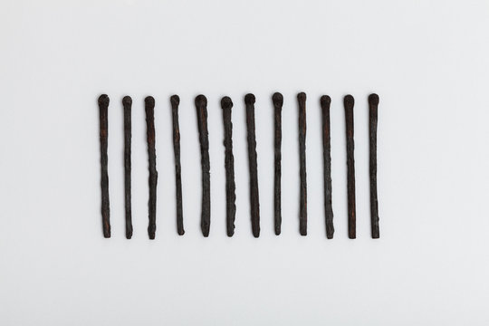 Five white cylindrical pillars of varying heights are arranged in ascending order against a minimalist gray background, resembling a bar graph.