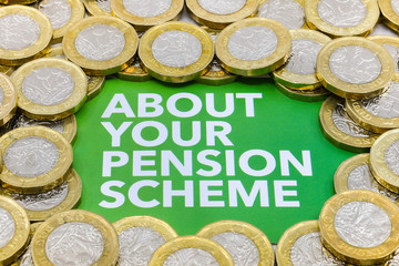 Top of a printed note with message "About your pension scheme" surrounded by piles of British one pound coins