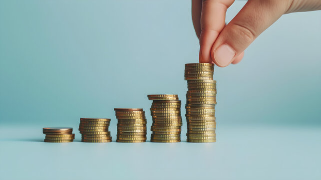 A hand stacking coins in ascending order on a blue background representing financial growth
