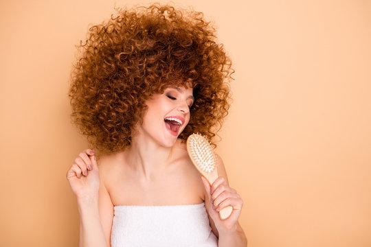 Close-up portrait of her she nice cute charming attractive lovely cheerful positive playful wavy-haired girl using comb like mic shower bath preparation isolated over beige pastel background