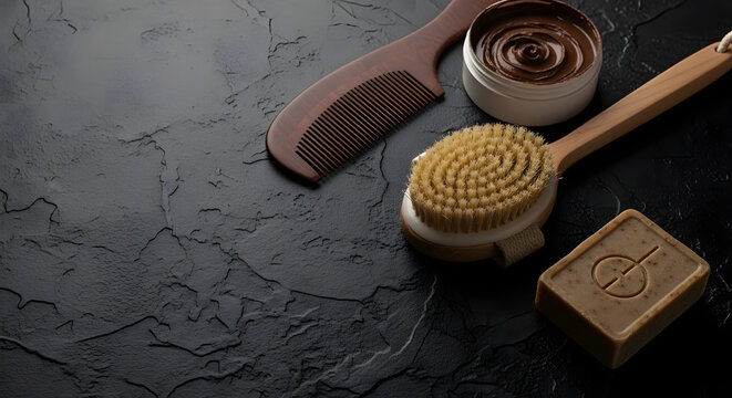 A luxurious spa arrangement featuring natural body care products like a brush, comb, soap, and cosmetic cream whisked into a daily self-care ritual.
