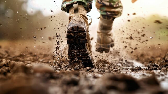 Close-up of military boots trampling through muddy terrain, capturing the action and energy of an outdoor adventure or training exercise.