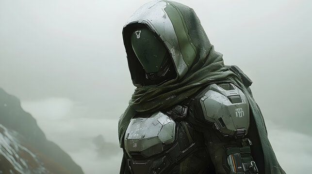 Futuristic soldier in misty mountains, overlooking valley, sci-fi concept art