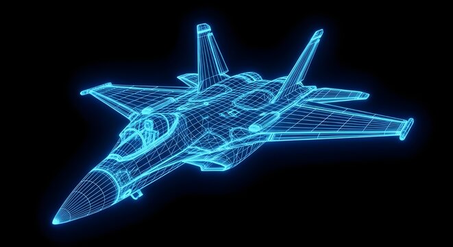 Futuristic Military Jet Fighter Wireframe Blueprint on Black Background Art