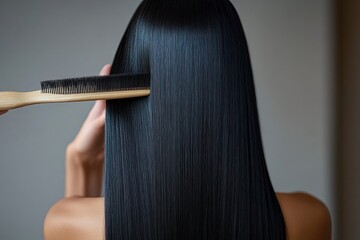 Person with long, straight, shiny black hair being gently combed with a wooden comb, showing smooth texture and sleek appearance from the back