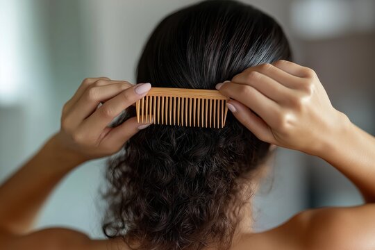 Woman combing her curly hair with wooden comb. Rear view. Natural hair care. Focus on hair. Personal care routine. Daily self-care. Healthy hair. Beautiful woman.
