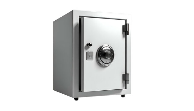 A white, metal safe, isolated against a black background, with a combination dial and lock