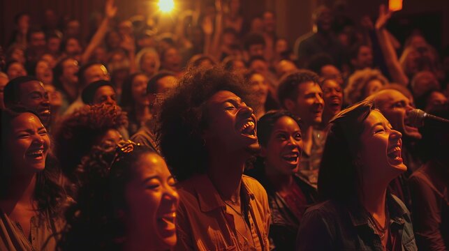 comedy show with comedian and laughing crowd