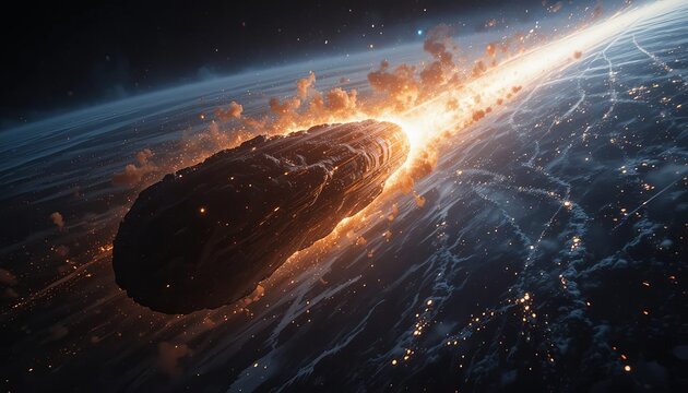 Dramatic fiery meteor streaking through near-earth orbit with molten plasma trail