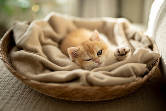 An adorable Golden British Shorthair Kitten looks at the camera with loving eyes and stretched her front paw as she relaxes on her cozy cat bed meowing at the camera partially bathed by the sunlight o
