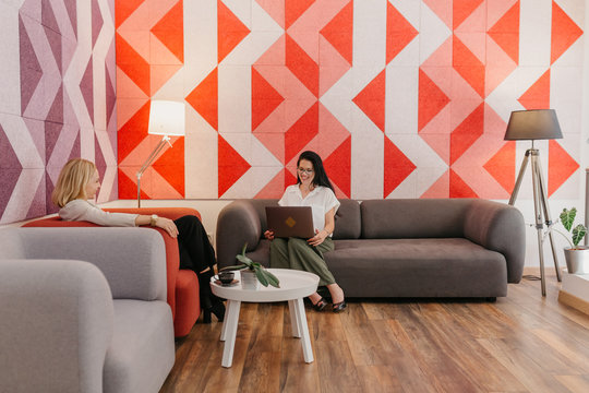 Modern Office Workspace Design with Colorful Modular Seating and Desks