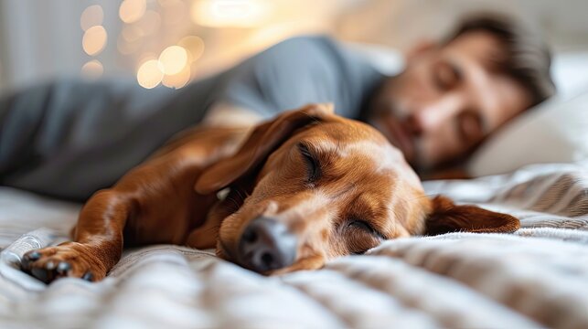 Young owner with brown dachshund sleeping together on comfortable bed at home