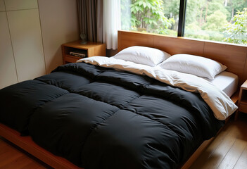 A cozy, modern bedroom featuring a comfortable bed with a plush black comforter and white pillows, set in a wooden frame against a window with a natural view.