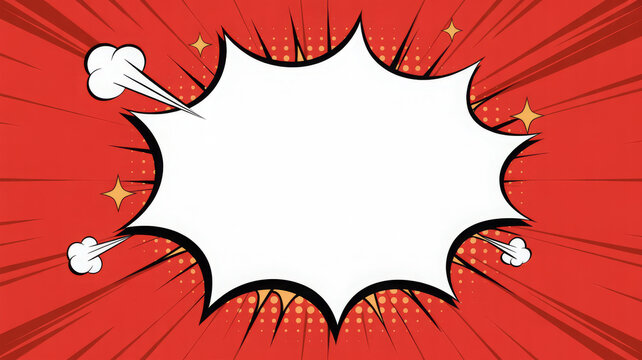 Pop art splash background, explosion in comics book style, blank layout template with halftone dots, clouds beams and isolated dots pattern on red backdrop. Vector template for ad, covers, posters.