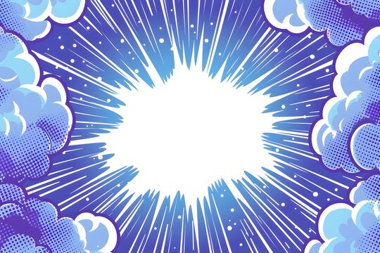 Abstract comic book style background with a blue and white color scheme, a cartoon explosion cloud design with copy space