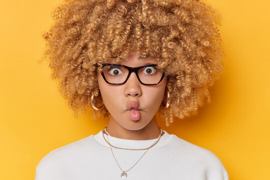 Human facial expressions concept. Surprised curly haired woman makes fish lips has wondered expression stares through transparent spectacles wears casual white jumper isolated over yellow background.