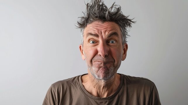 A man with a disheveled expression sporting wild hair and a scruffy beard gazing directly at the camera with puzzled and concerned On his face.