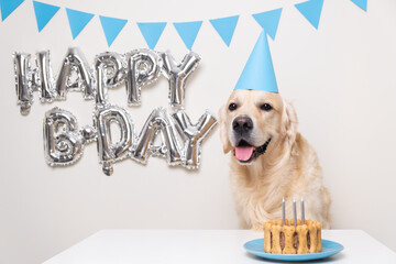 Cute dog sitting with cake and balloons at a birthday party. Golden retriever wearing a blue birthday cap. A pet's birthday party