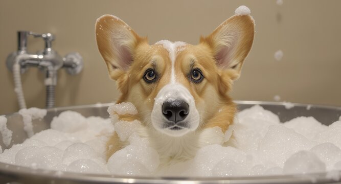 A fluffy dog enjoying a luxurious bubble bath, looking directly at the camera