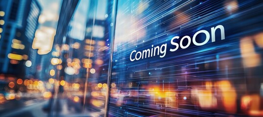 Modern Coming Soon Banner with Glass Effect and Blurred Cityscape Background for Marketing