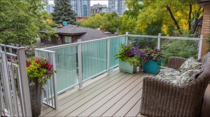 Pano Two storey house with wooden deck overlooking the yard and scenic nature views