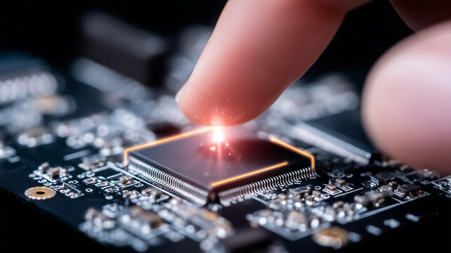 Finger activating a microchip symbolizing human interface innovation and advanced computing power.