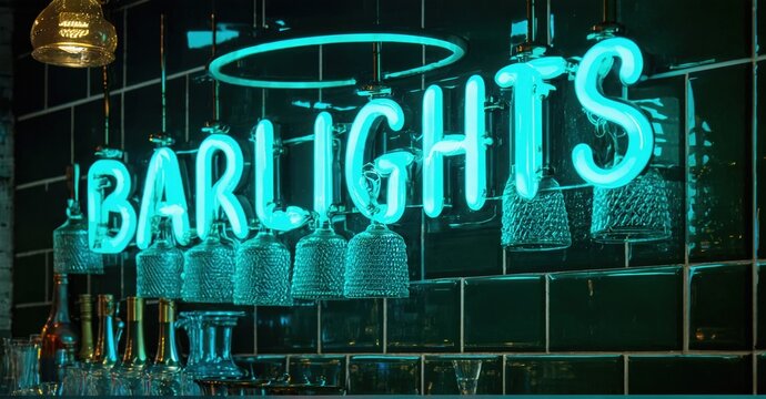 Neon sign spells BARLIGHTS. Glasses line shelf behind it. Dark moody atmosphere, vibrant turquoise glow dominates scene.