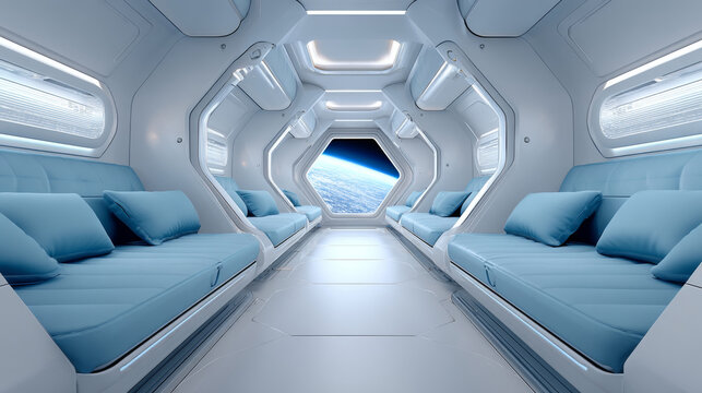 A futuristic, clean and spacious interior of a spacecraft with blue seats overlooking Earth from space