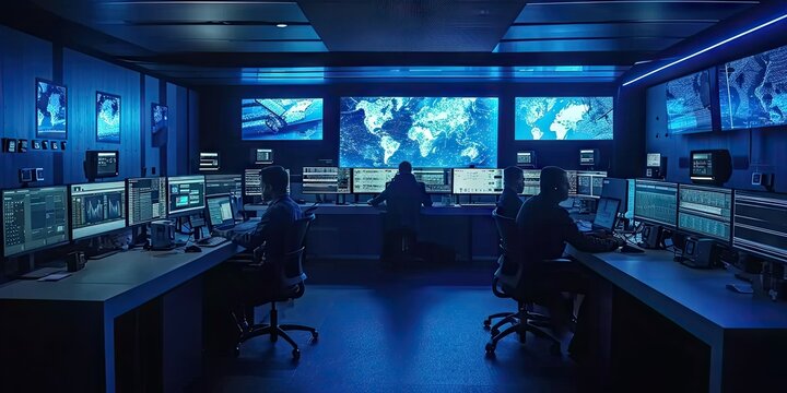 Military surveillance team tracks threats on computer screens in central office, ensuring national security through control and monitoring.