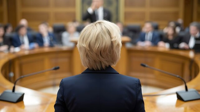 Confident businesswoman addressing a formal committee meeting, commanding attention with poised authority in a distinguished wood-paneled chamber, fostering impactful dialogue and decision-making.