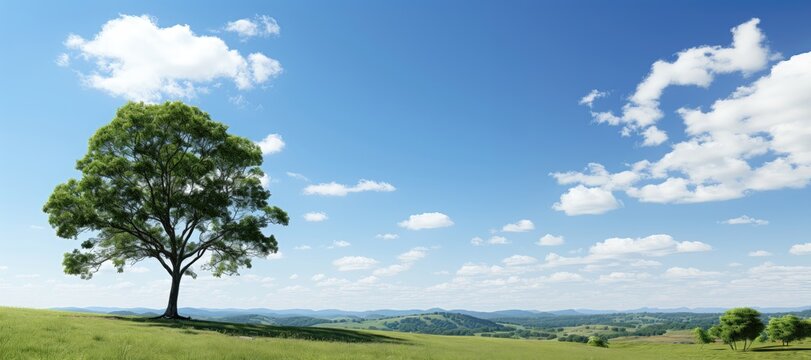 A tall green tree stands proudly on a hill, commanding attention against the backdrop of a wide open landscape, creating a majestic and expansive scene in nature.