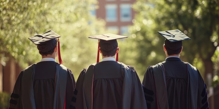 Three graduates wearing academic gowns and hats, ready for commencement.