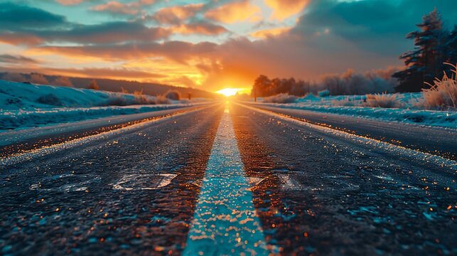 old road same road safe road fresh start quote written on fancy steel signpost outdoors by the sea. Soft Blue ocean bokeh background.