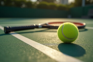 Sunlight bathes a green tennis court in warmth during late afternoon, as a bright yellow tennis ball rests beside a black racket, inviting a game to commence