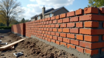 Muro de ladrillo parcialmente construido con mortero fresco aplicado entre bloques rojos uniformes