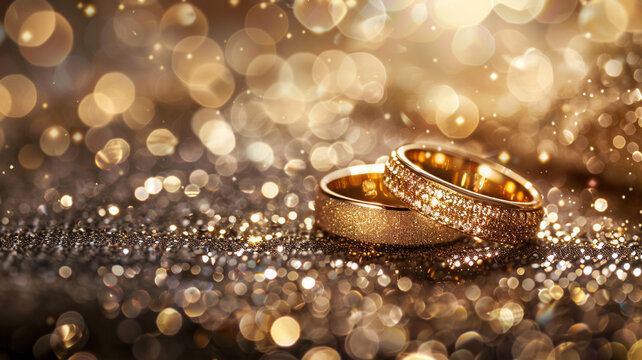 Gold wedding rings on a white ring pillow with ample space for text Elegant background suitable for wedding invitations