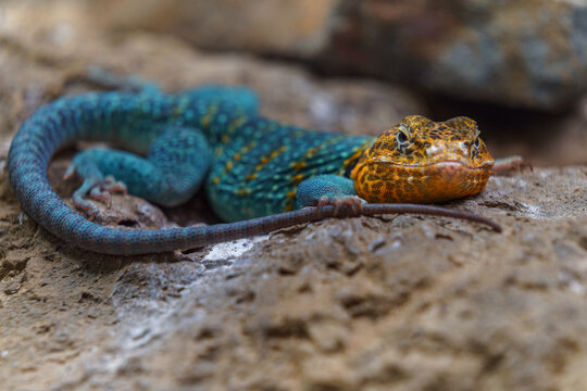 Colorful native lizard sunning on a boulder in the American Southwest Copy space image Place for adding text or design