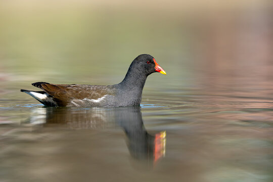 waterhen (Gallinula chloropus) swimming on beautiful calm waters of lake
