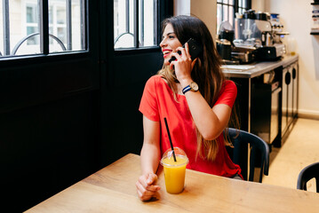 Young woman on a phone call on mobile phone and drinking juice in cafe