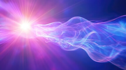 Bright energy light emanates, creating a flowing, vibrant, abstract wave of luminous blue and purple lines, representing data streams, communication, or quantum flow